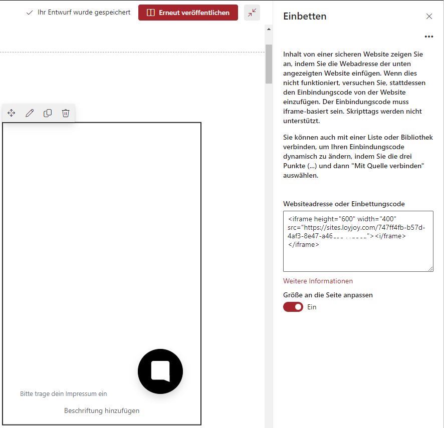 - Paste the iframe code into SharePoint's embed text field to integrate LoyJoy chat into your SharePoint site."